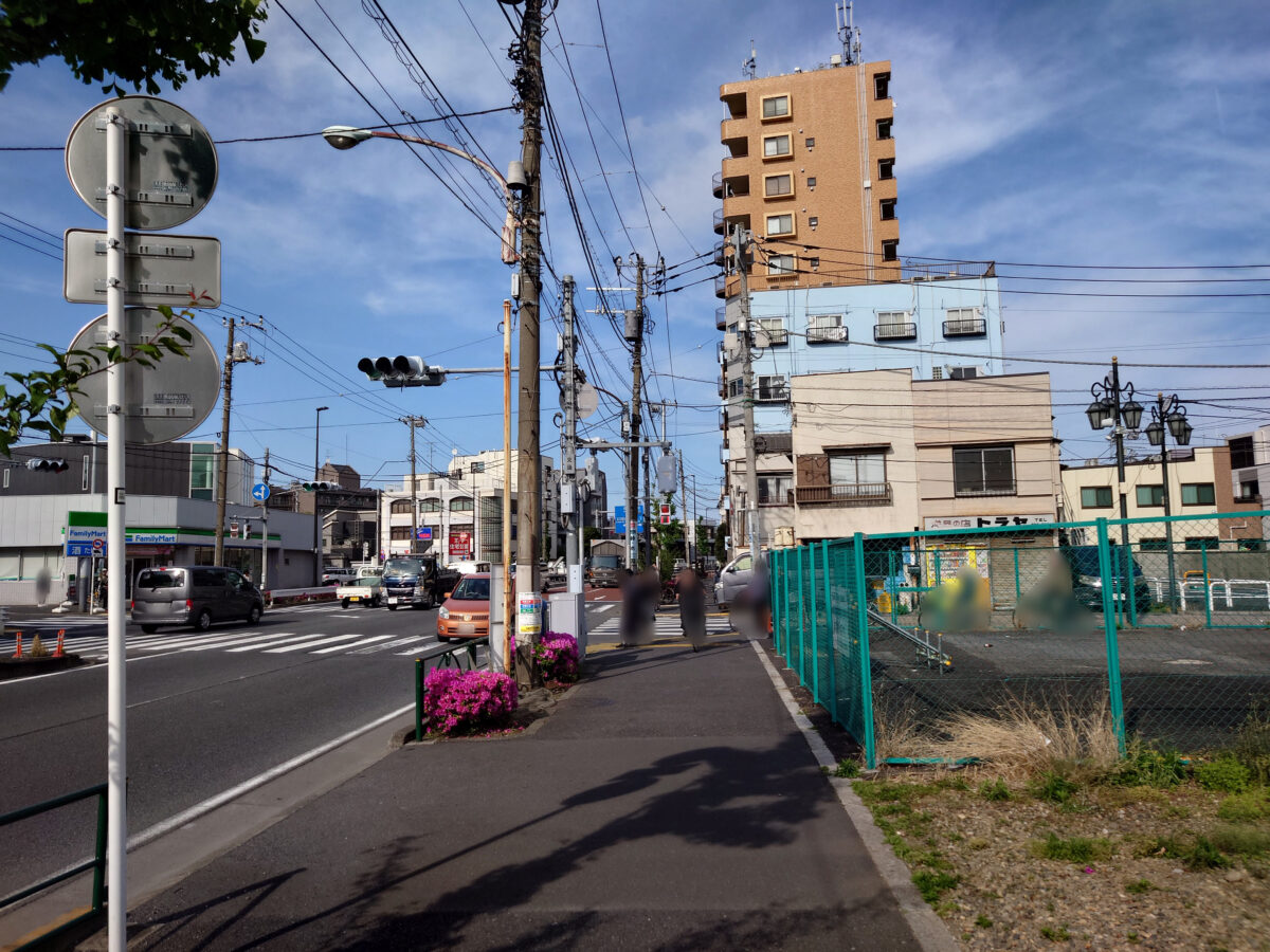 この場所を背にして右はこんな感じ。すぐに富士見銀座で、横断歩道を渡るとファミリーマート。