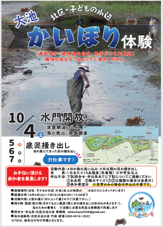 10月4日(土)~7日(火)。各日午前9時~正午。北区・子どもの水辺にて。4日(土)は定置網にかかった生き物を観察します。5日(日)以降は泥をかき出す力仕事。たくさんのご協力をお待ちしています。