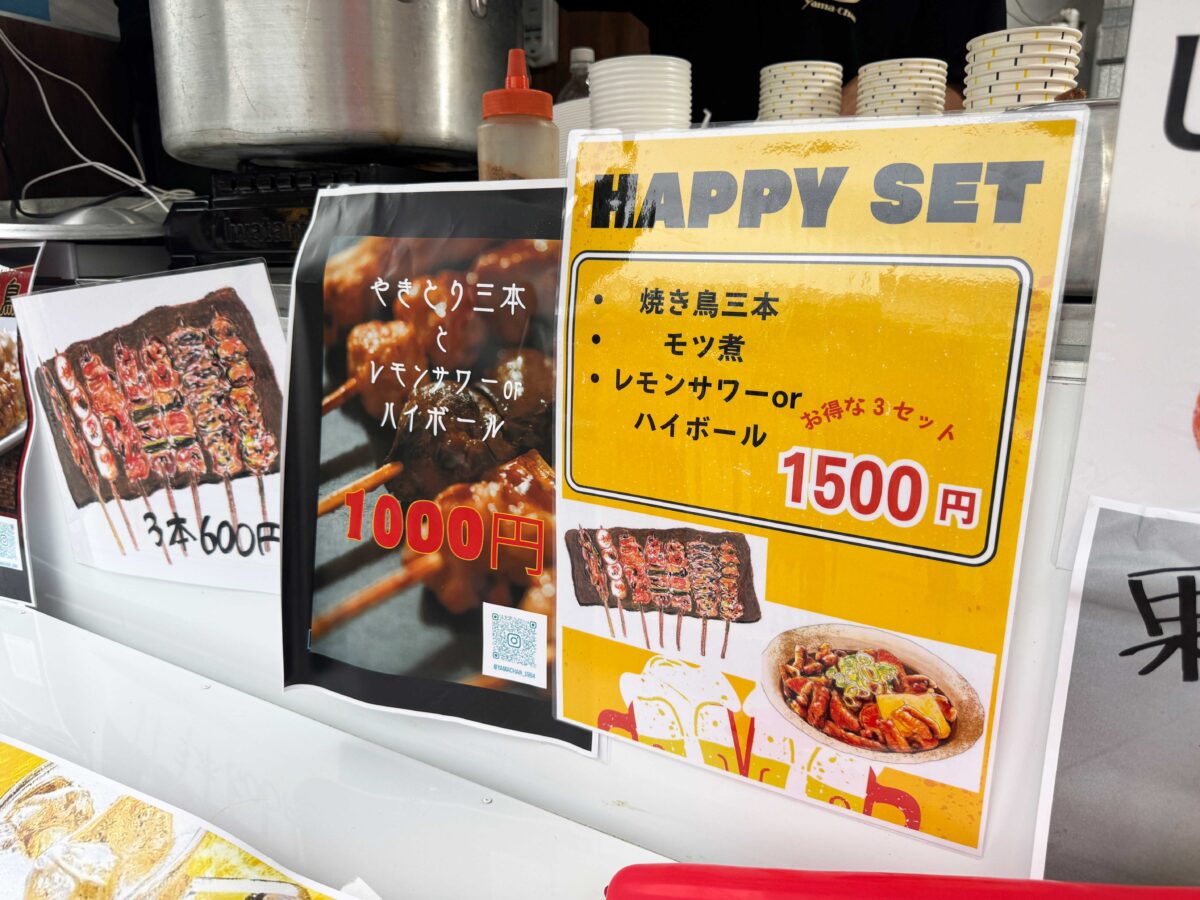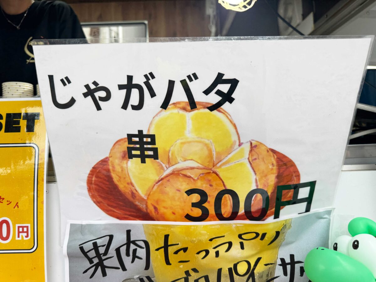 モツ煮込みや、焼き鳥、じゃがバタ串などが販売されていました。