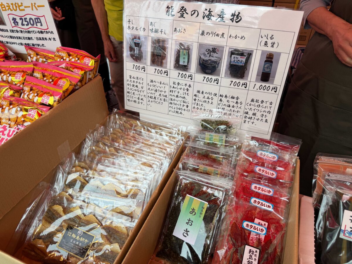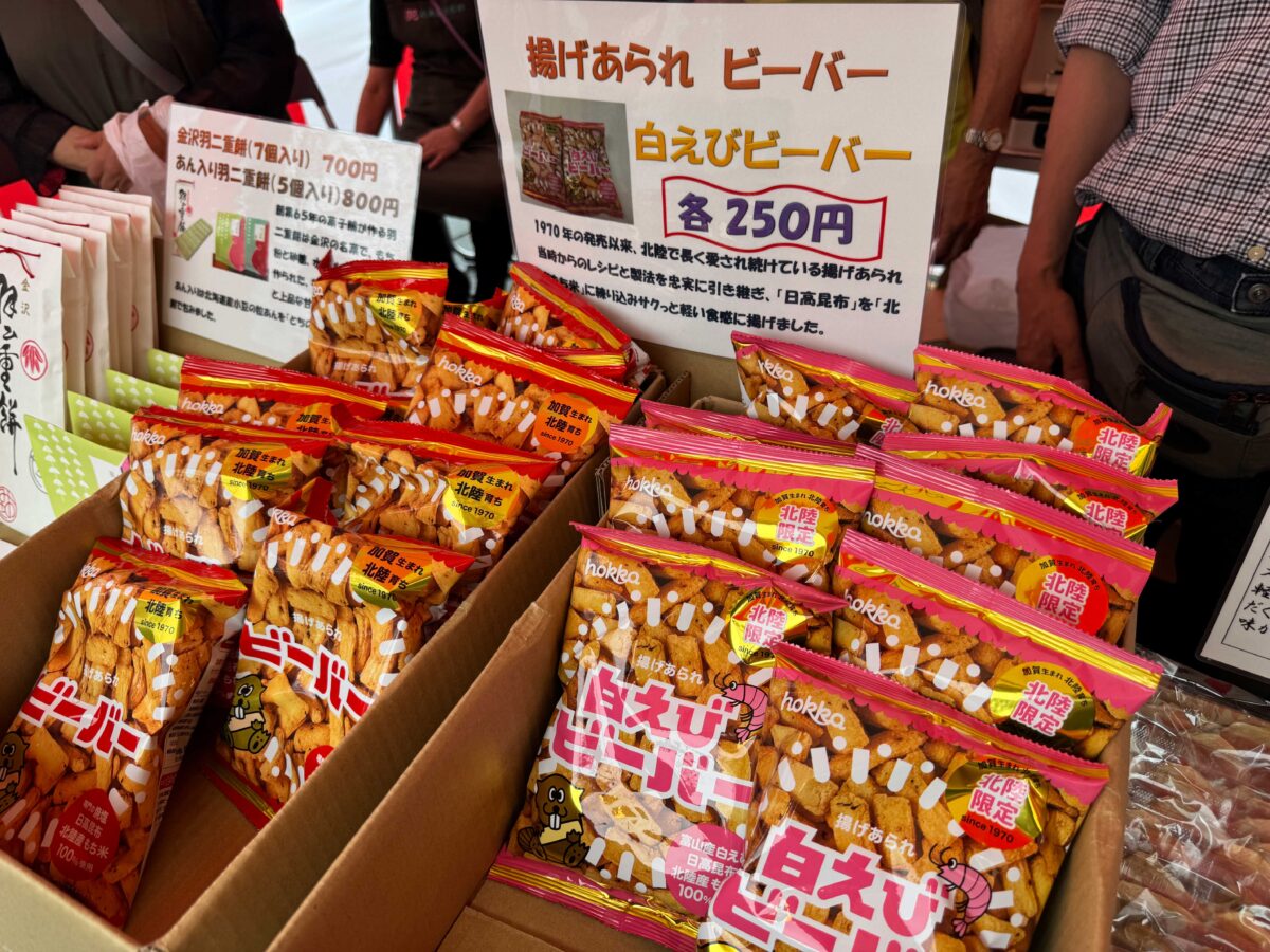富山の名産品「ビーバー」や、能登の海産物などが販売されていました。