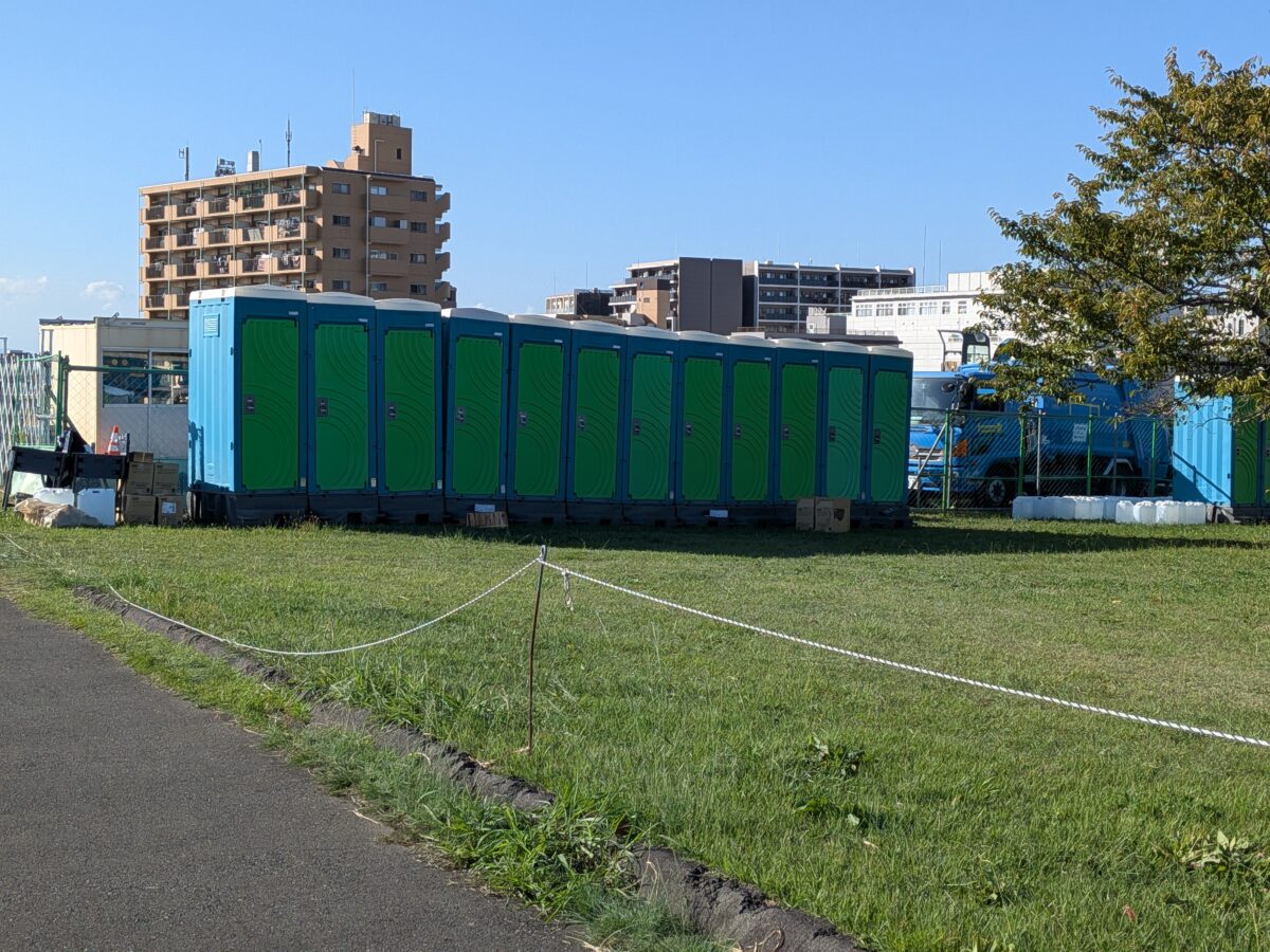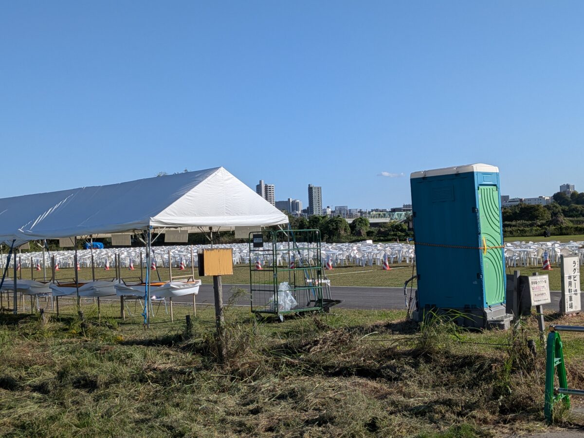 荒川土手の上には仮設トイレが既に説明されてました。