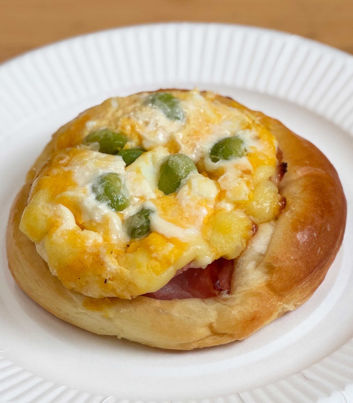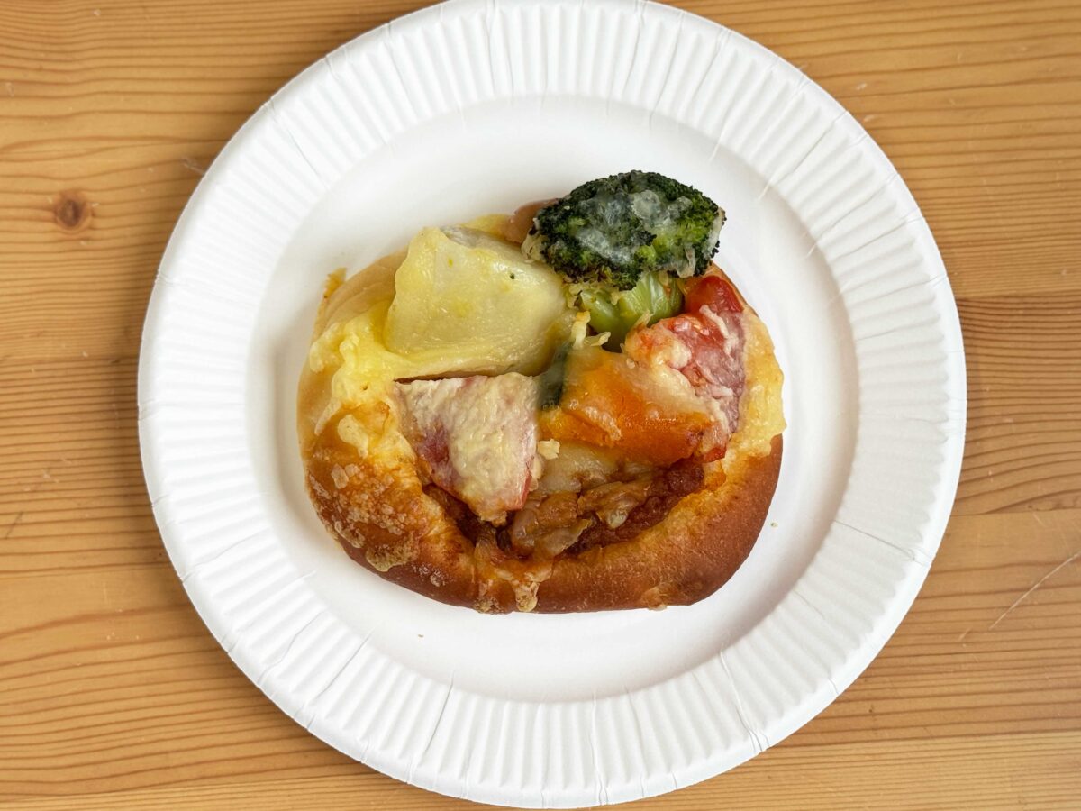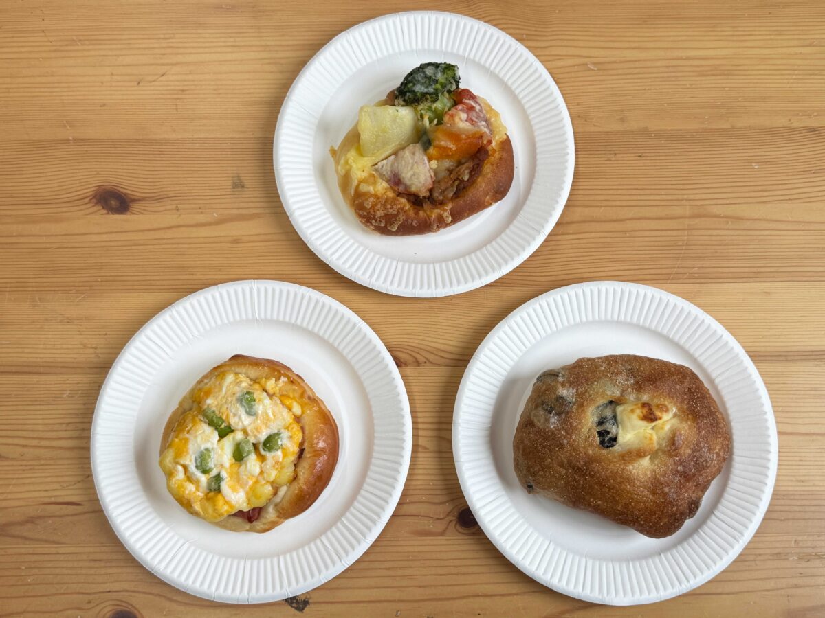 上から時計回りに「pizza ベジタブル」、「オーガニックレーズンとクリームチーズ」、「たまごサラダと枝豆のハムチーズ」です。