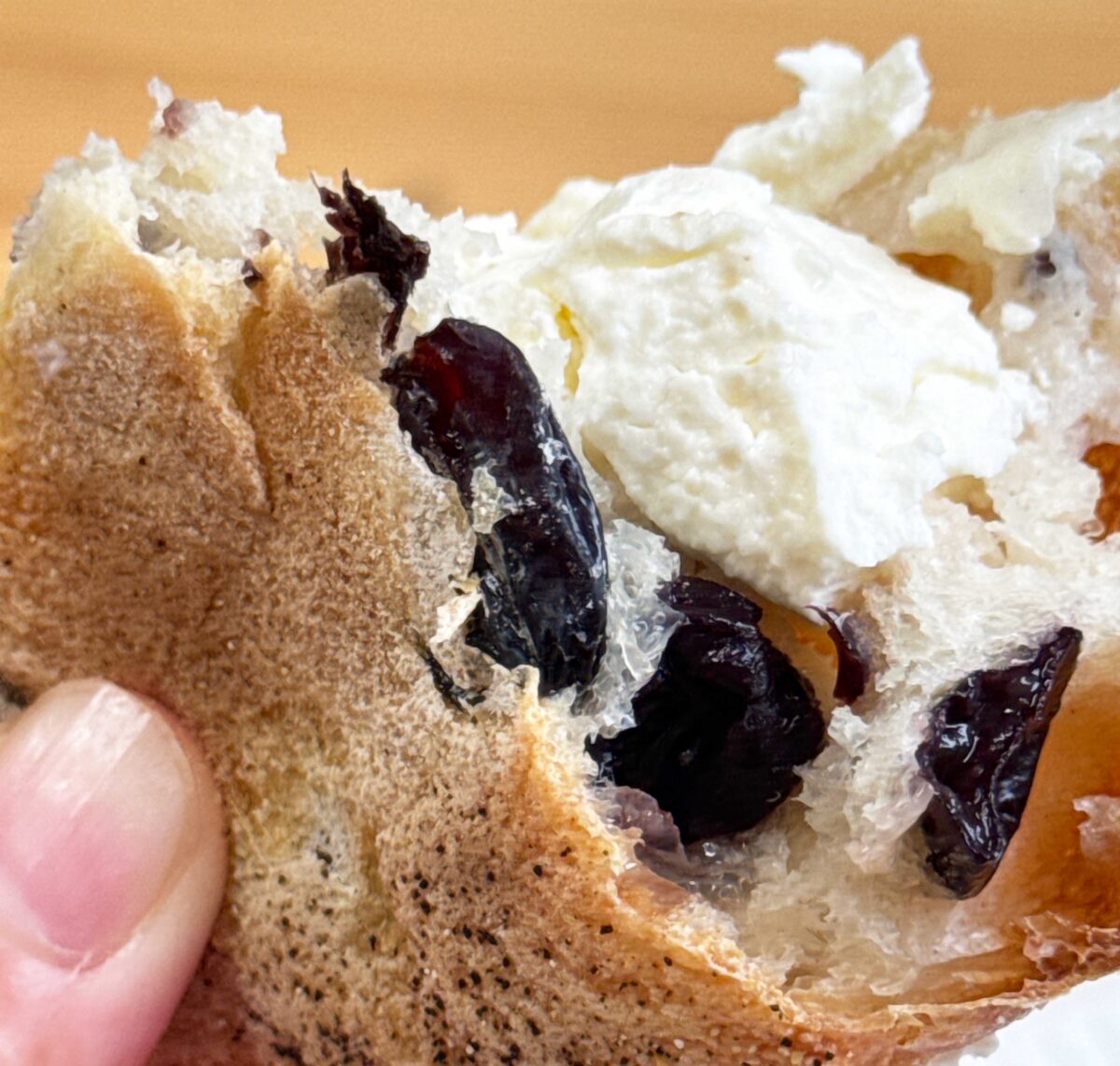 かじってみると、クリームチーズのさっぱりとしたコクに、レーズンの自然な甘さが引き立って絶妙なバランス♪