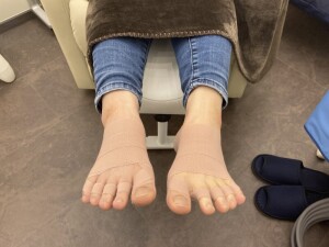 →保湿とかぶれ予防として、アンダーラップジェルを塗りながら、足ゆびや関節の体操をおこないます。