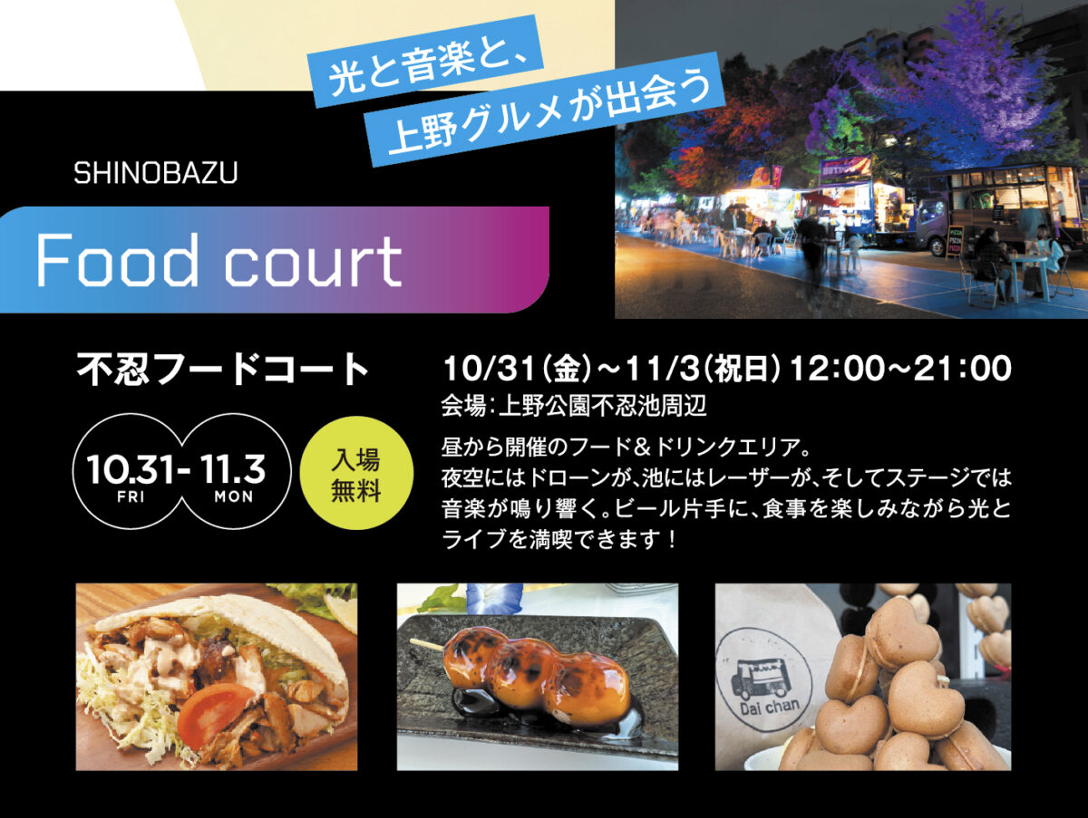 また、不忍フォトステージ & 不忍池の周辺では、ドローンショーとレーザーアートを背景に、光に包まれるフォトスポット、そしてフードコートも。