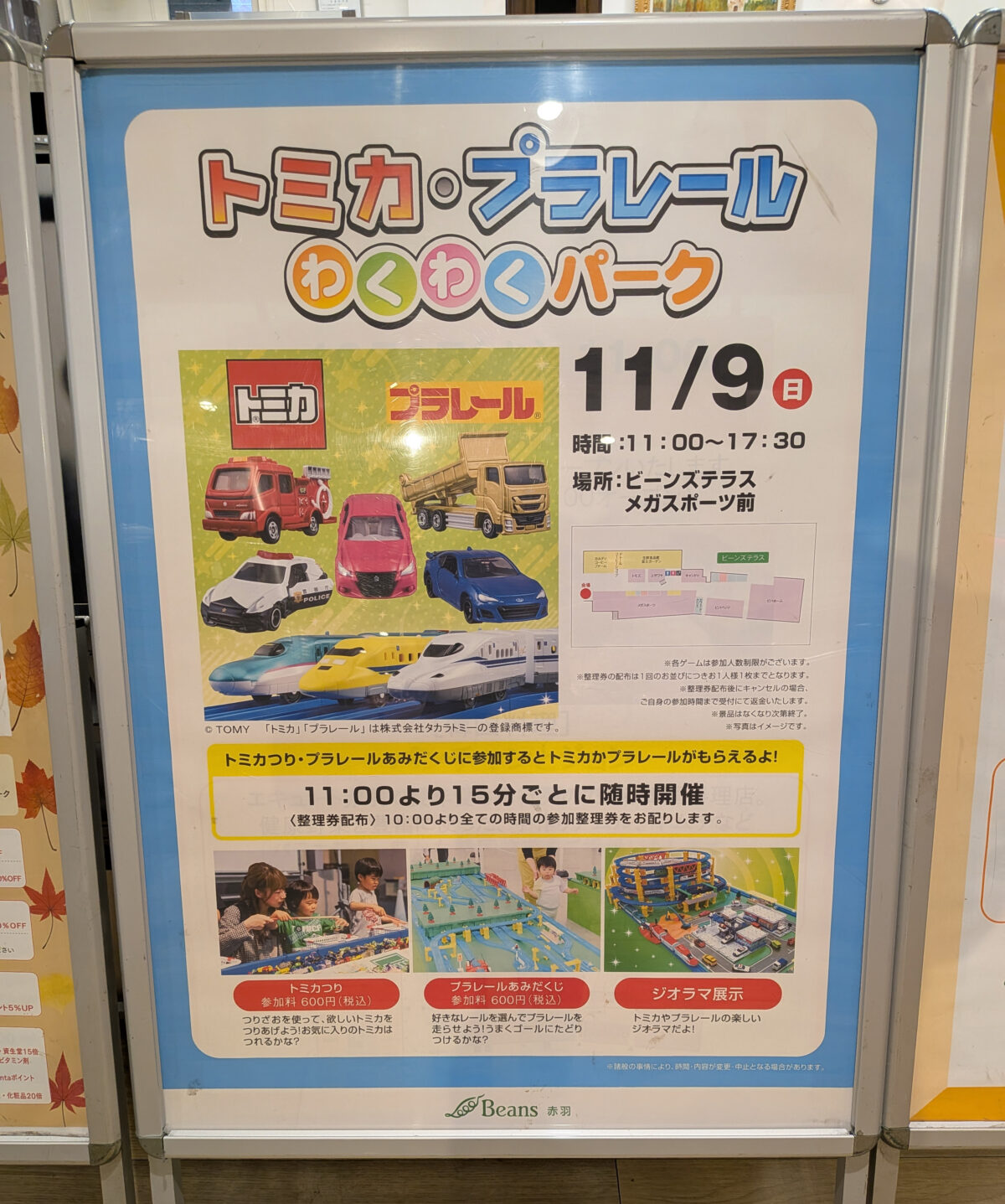 ビーンズ赤羽で11月9日(日)に「トミカ・プラレールわくわくパーク」が開催されるみたい!昨年開催されたときには、100人を超える大行列ができた、超人気イベントですよ♪