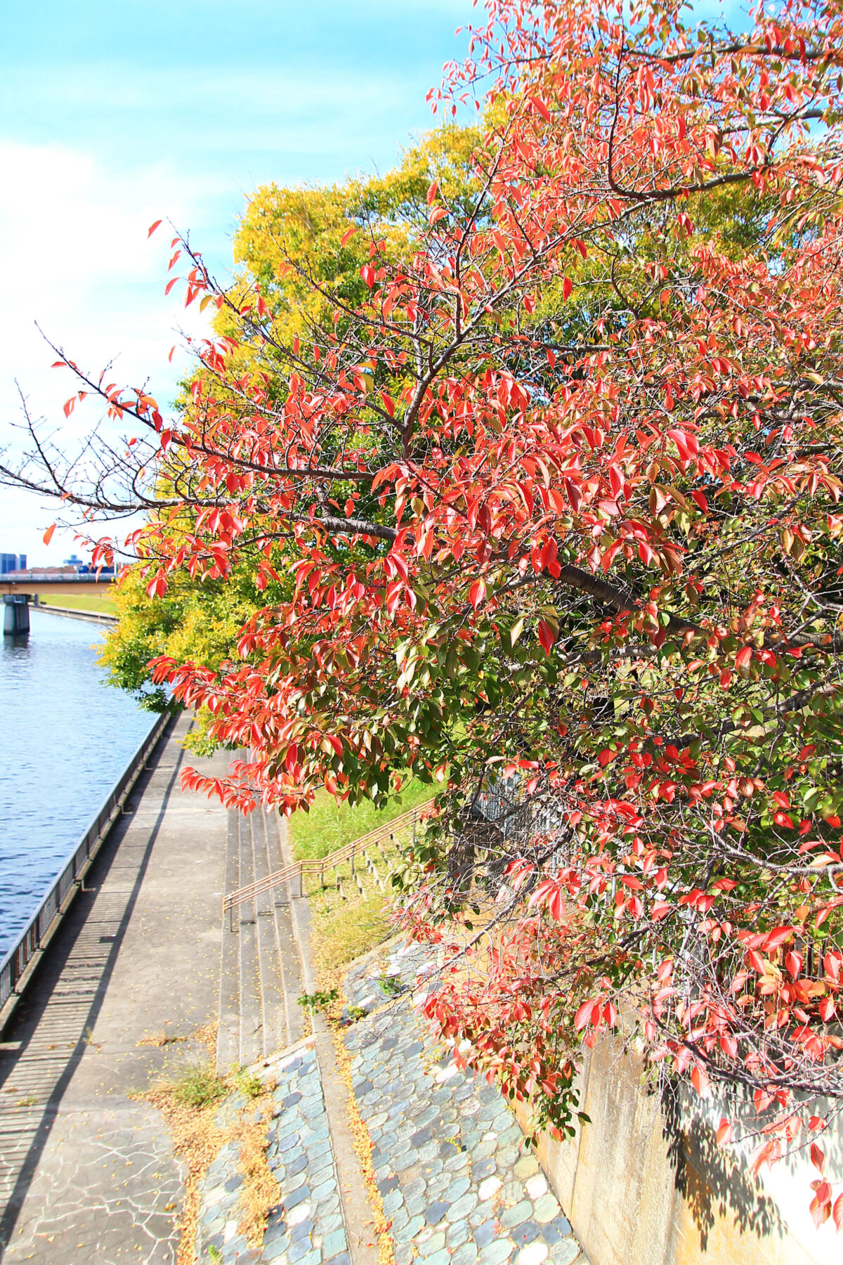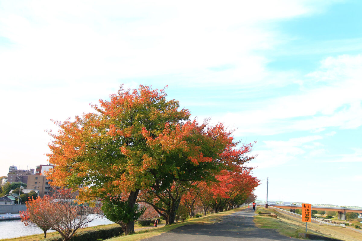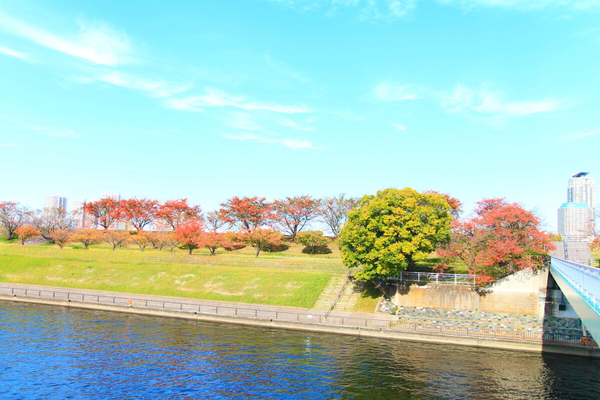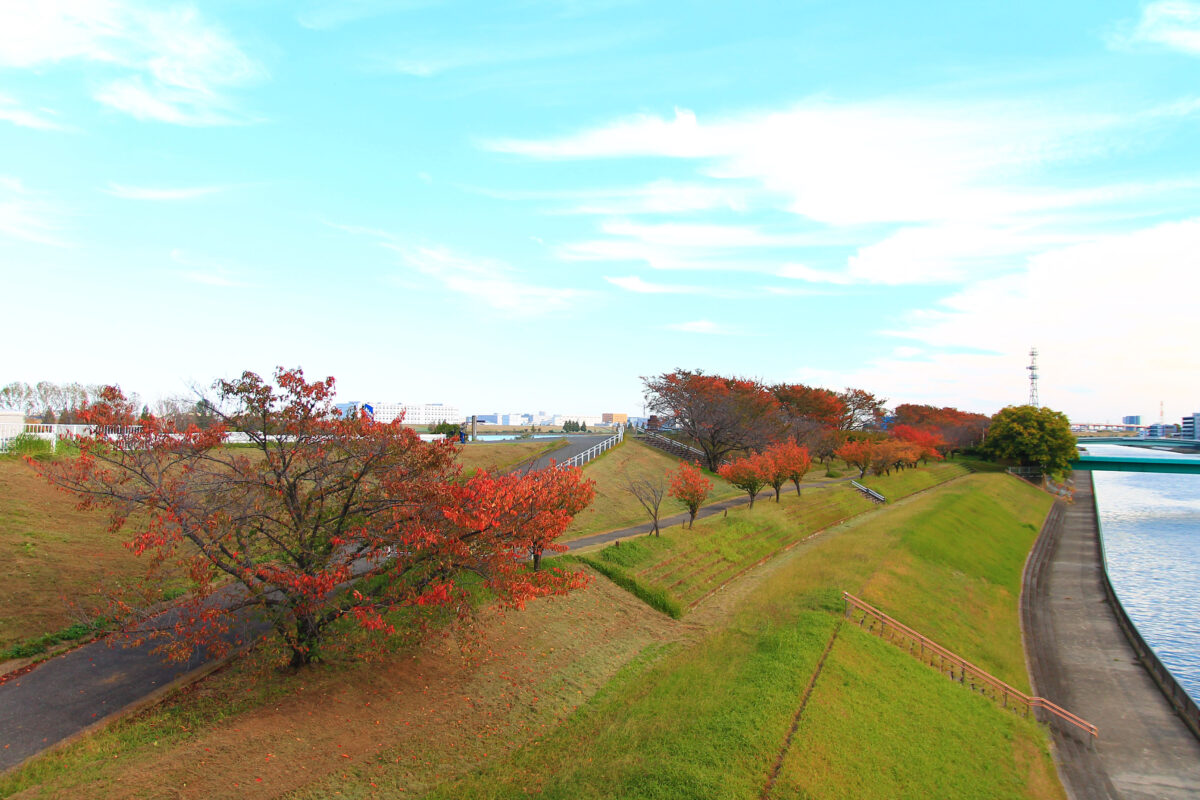 赤羽の荒川土手。青空に葉っぱが色づいた風景が気持ちものんびり♪