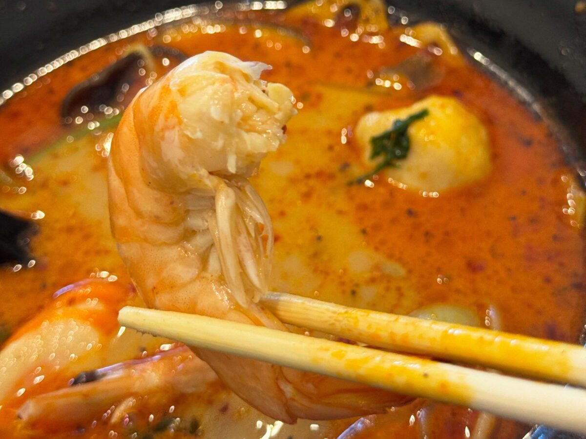 海老の頭を取ってガブリ。あ〜、自分の好きなものを取って食べていくスタイル、やっぱり楽しいなあ♪