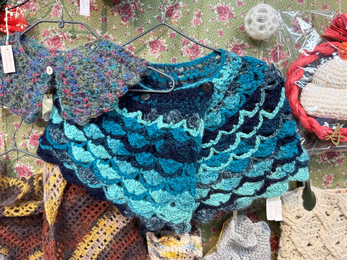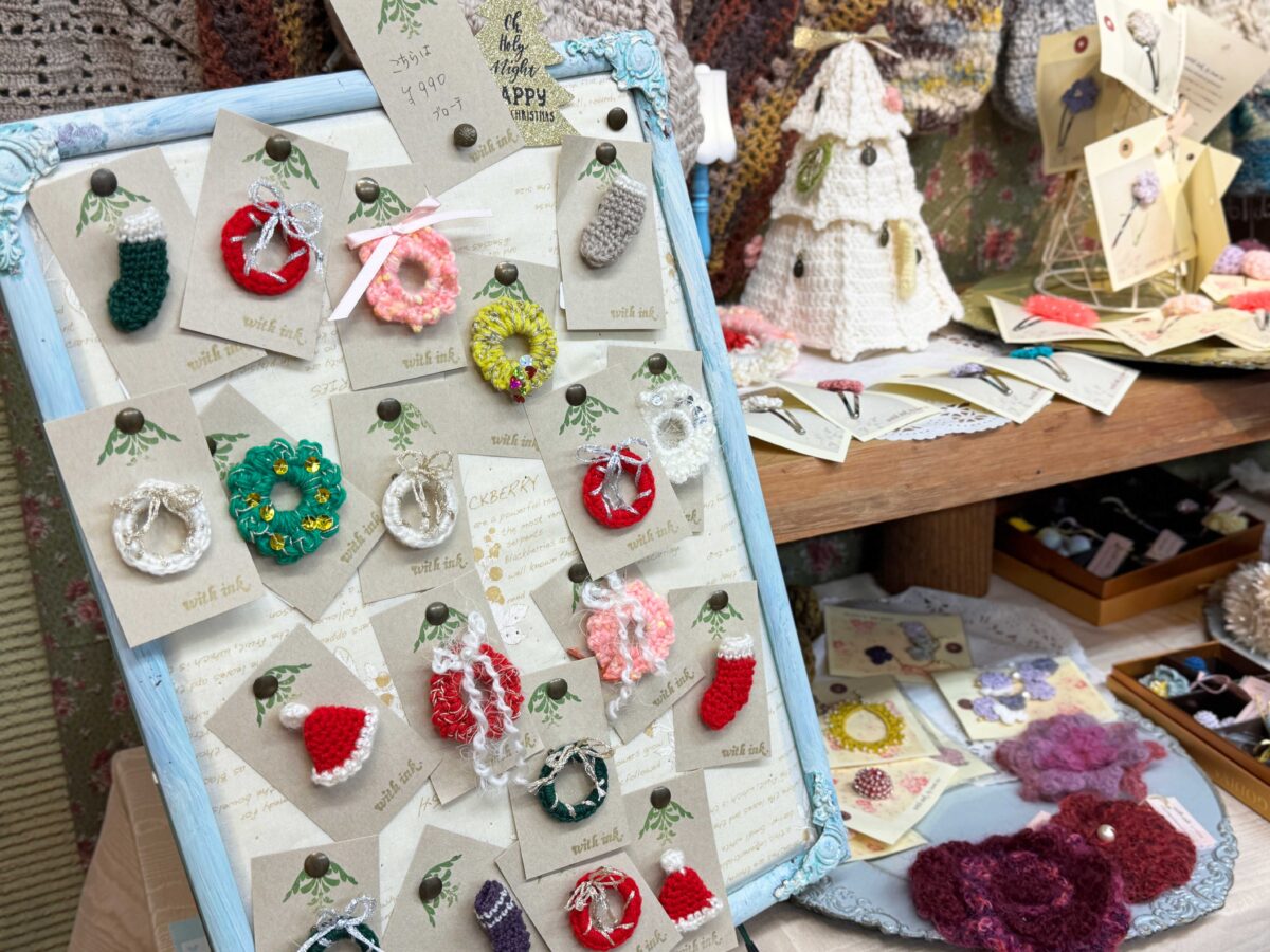 毛糸で作られた作品の数々が。ブローチや、ヘアピン、ケープなどさまざま。