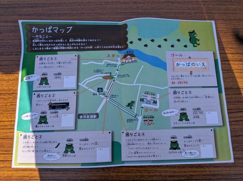 各会場と会場を結ぶ道にいる5匹のかっぱをみつけて正解すると、しるしをもらえるみたい。すべて答えると、お礼をもらえるんだって。