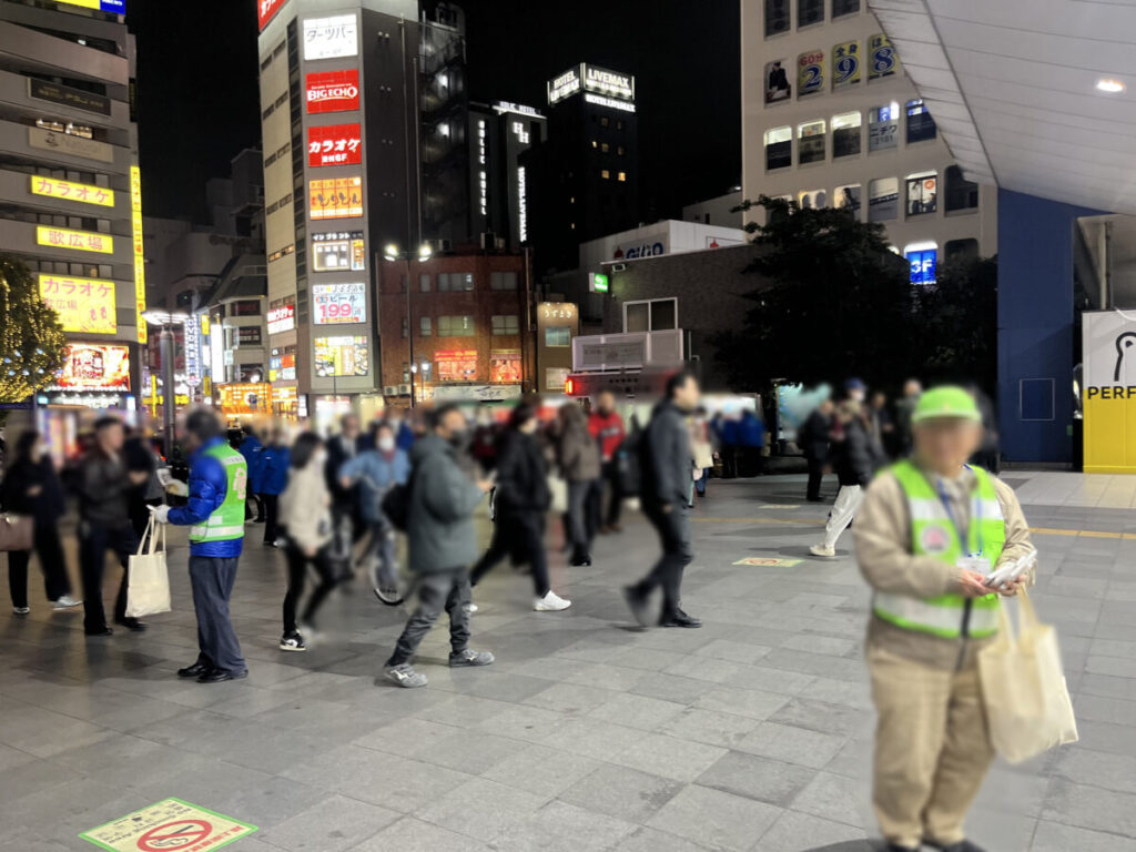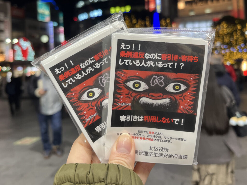 18時少し過ぎ、警察の方や北区役所のビブスを着た方たちが一斉に「客引き・客待ち防止」ティッシュを配り始めました!