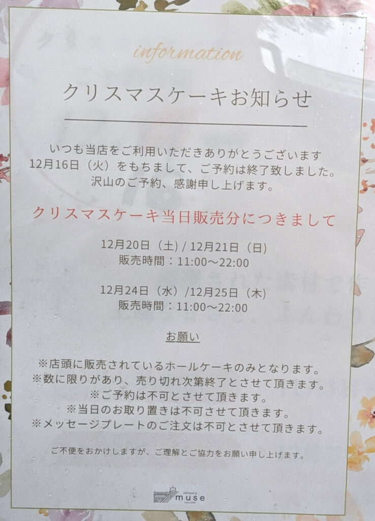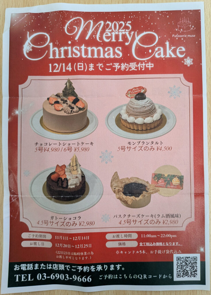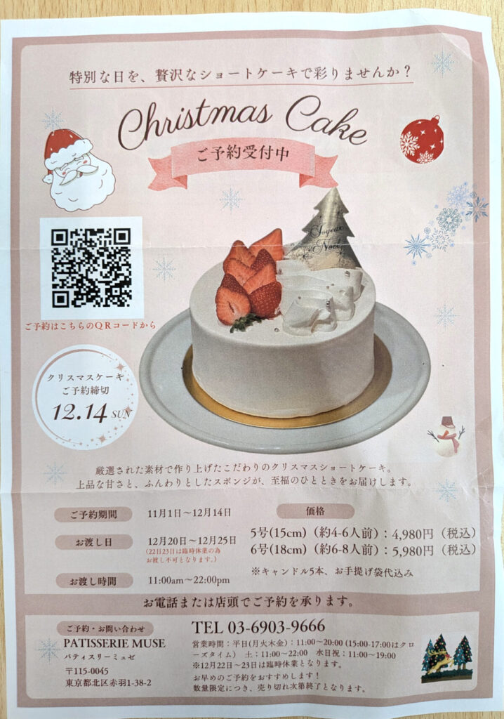 赤羽の「パティスリー・ミュゼ」のクリスマスケーキがめっちゃ人気みたい。
