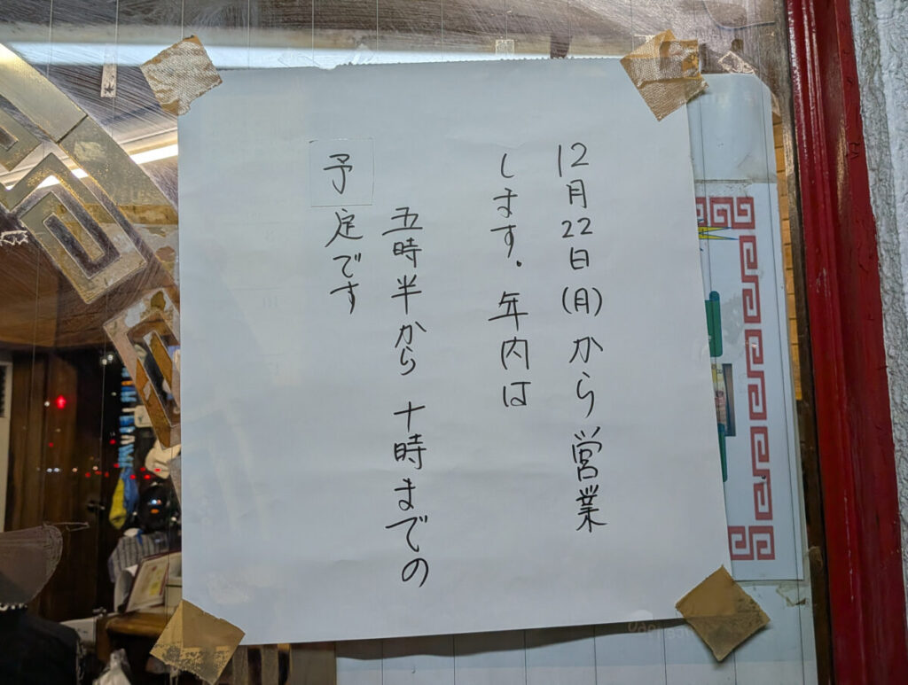 「12月22日から営業します。年内は五時半から十時までの予定です。」と張り紙がでてました。