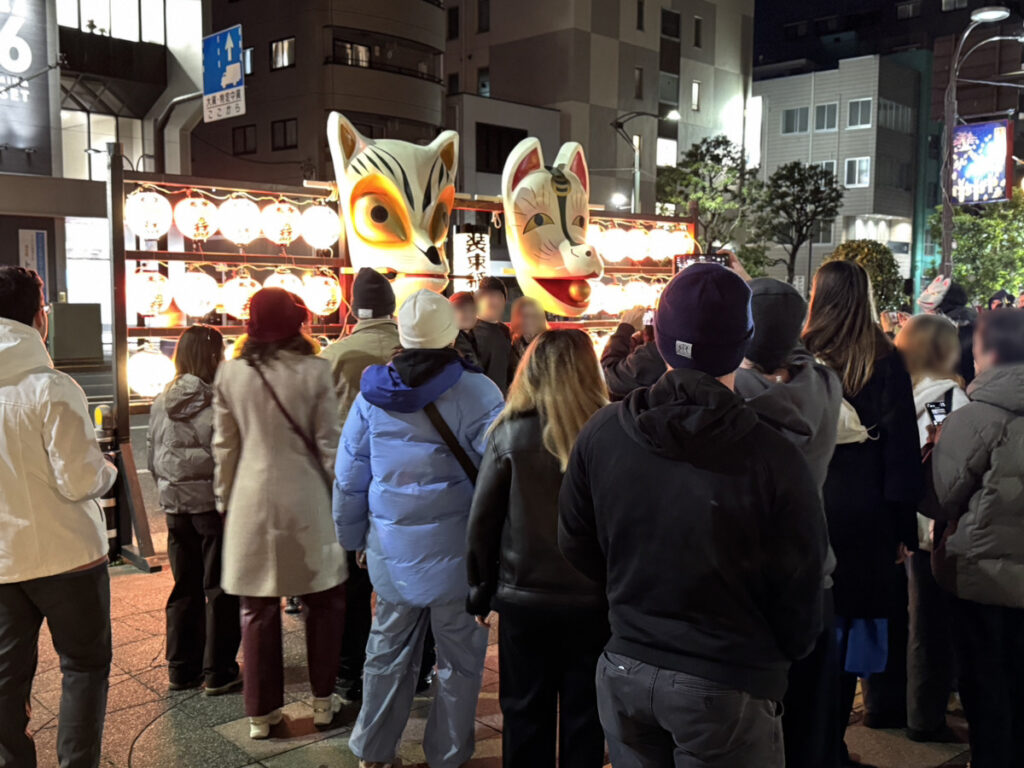 狐の大きいお面の前では、たくさんの人が記念撮影されています。