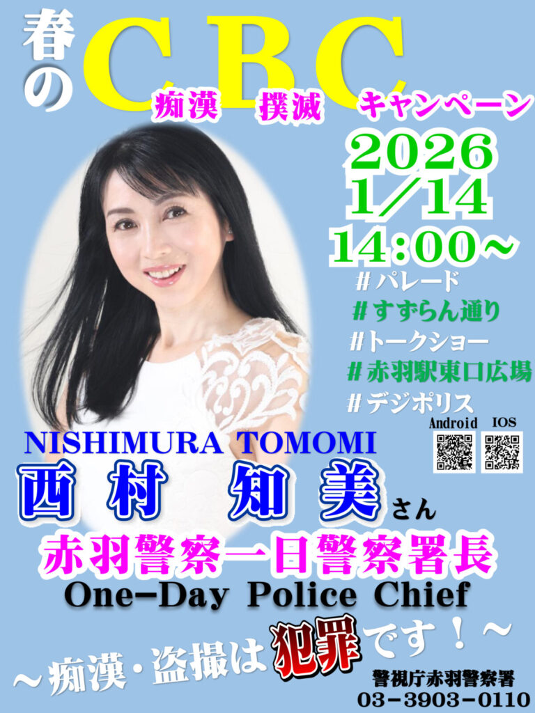 1月14日(水)、赤羽警察署の一日警察署長にタレントの西村知美さんが就任、受験期における痴漢撲滅キャンペーンを行うみたい。