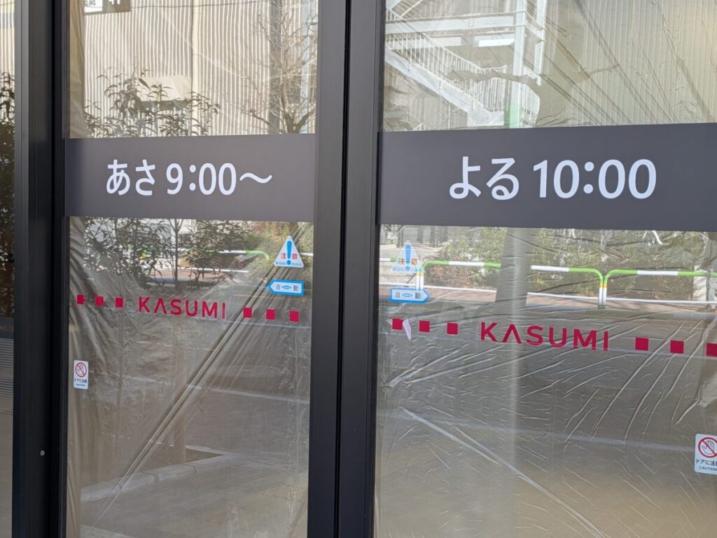 入口の扉付近には「KASUMI」の文字が掲示されており、あわせて営業時間の案内も確認できました。