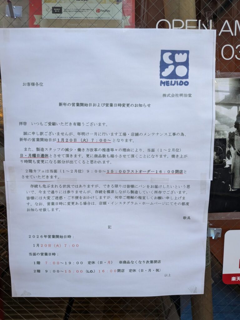 王子にある老舗パン屋さん明治堂、店頭に「新年の営業開始日および営業日時変更のお知らせ」の張り紙が出ていました。