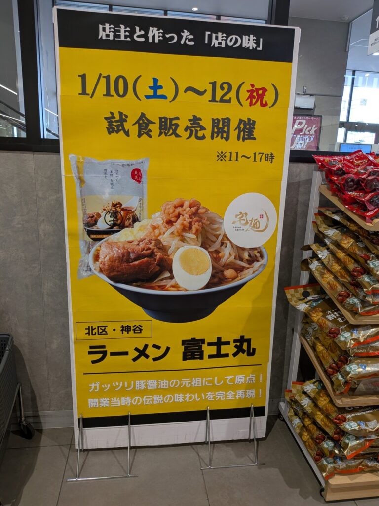 1月10日から12日までの3日間、イオンスタイル赤羽で、「ラーメン富士丸」宅麺の試食会やるみたい。
