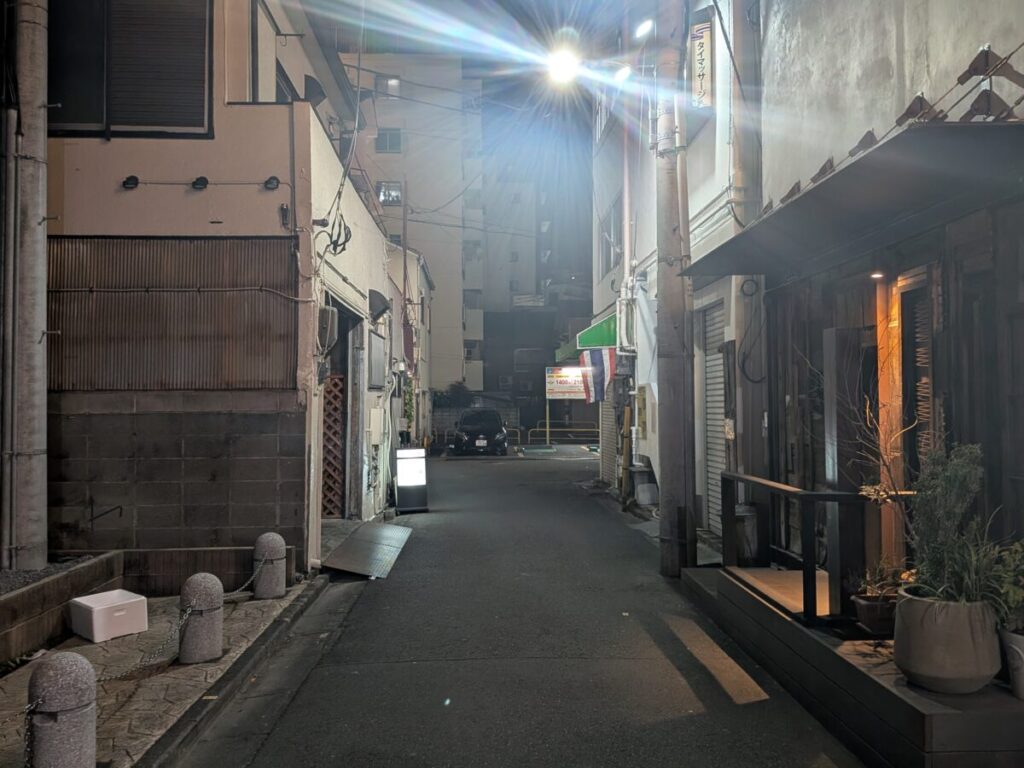 「炉端とおでん 別邸 ろば炭魚」ができると思われる場所を背にして左はこんな感じ。こっちにいくと、「カプセルホテル&サウナ コスモプラザ赤羽」。