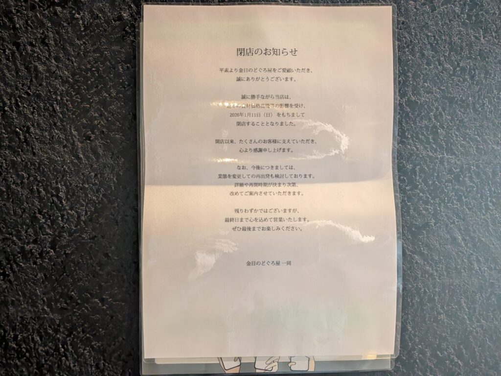 店頭には1月11日をもって閉店の案内がでてます。「業態変更して再出発も検討しております」と記載がありますよ。