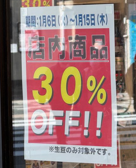 期間は1月15日(木)までで、店内商品30%OFF(生豆のみ対象外)とでてますよ。