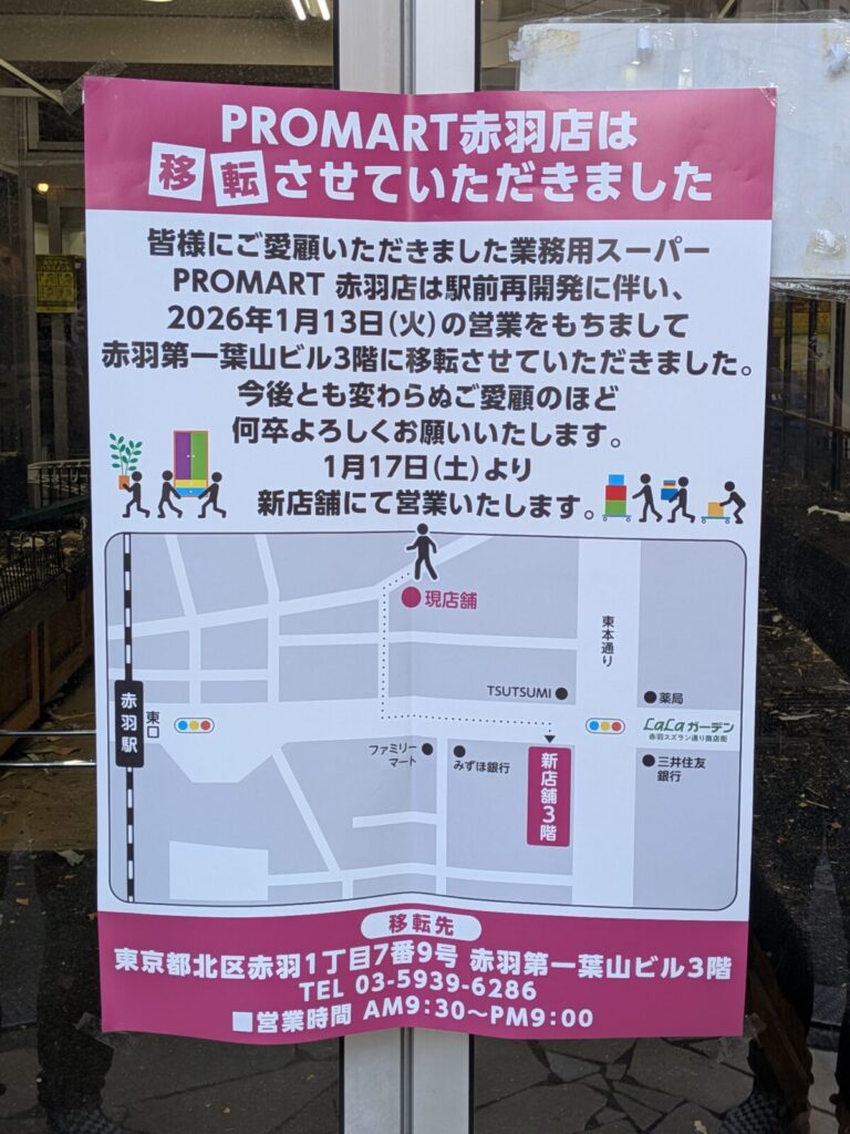 こちらが店頭にでてた移転の案内↓「PROMART赤羽店は移転させていただきました」とでています。