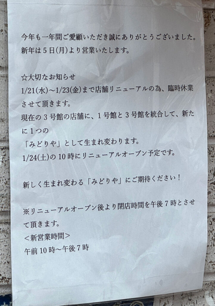 また、「現在の3号館の店舗に、1号館と3号館を統合して、新たに1つの「みどりや」として生まれ変わります。」ともありましたよ!