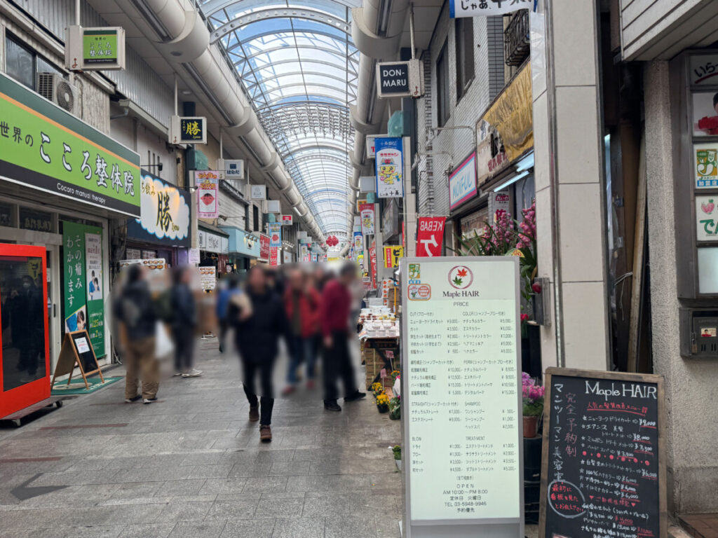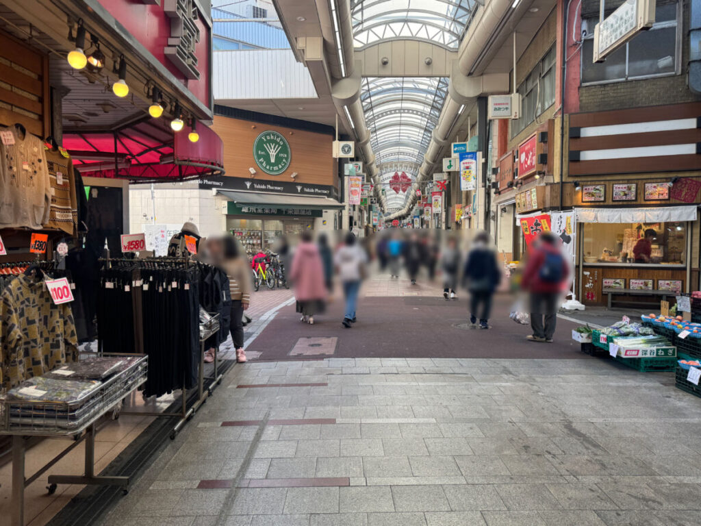 入り口を背にして右はこんな感じ。「てこや」や「雄飛堂薬局」、「セブンイレブン」などがあります。