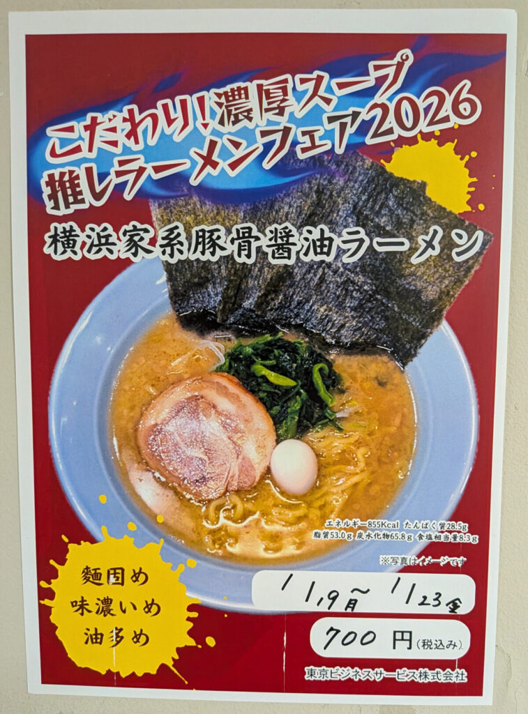 こだわり濃厚スープ 推しラーメンフェア2026!「横浜家系豚骨醤油ラーメン」・・・なんて魅惑的なメニューが北区役所の食堂に登場なんだ。期間は1月23日(金)までとでてますね。