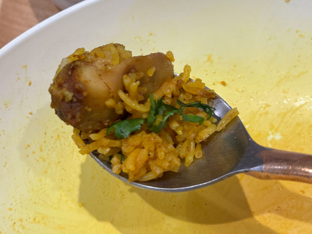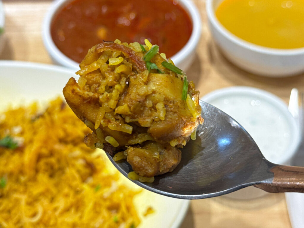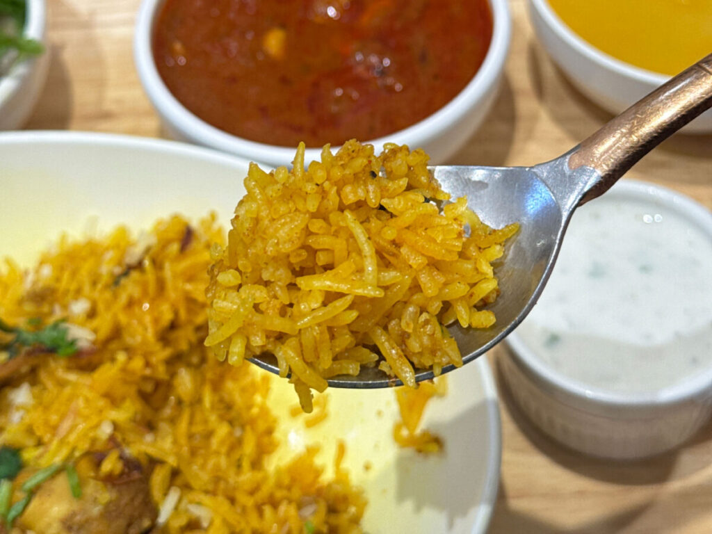 うっは〜!パラっパラタイプのビリヤニだ!ご飯の粒、ひとつひとつにしっかりと味がついていてうんまい!