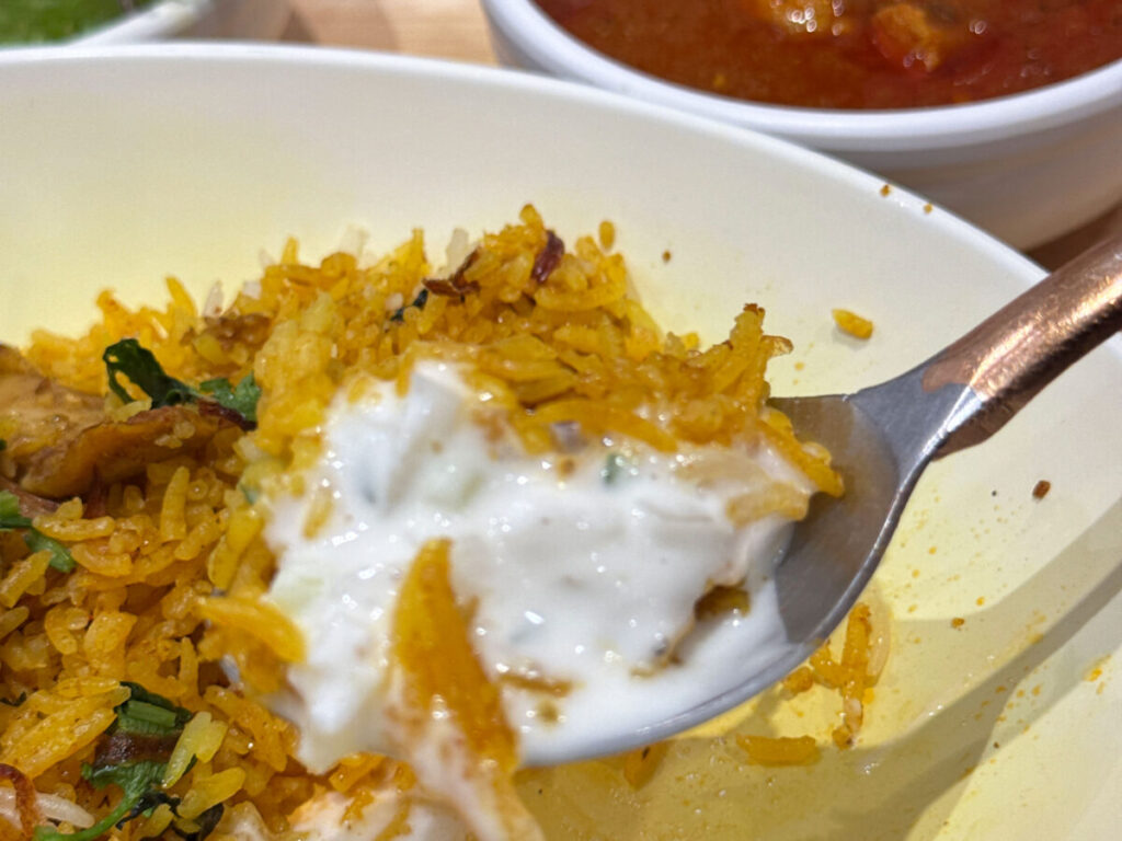 さあ、ここからは一心不乱にビリヤニを食していく〜!ライタをかけて味変といきますか。