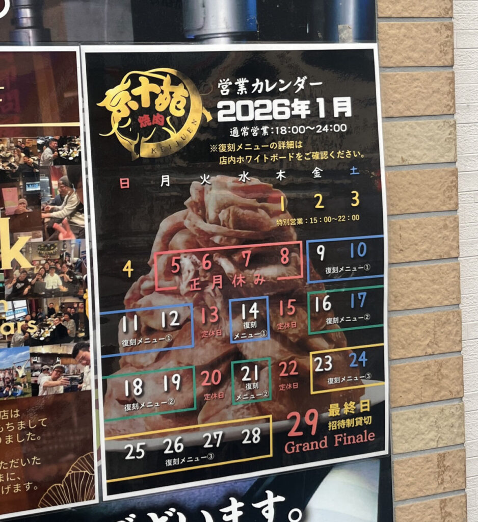 その横に貼ってあった営業カレンダーによると、最終日の29日(木)は招待制貸切とのこと。