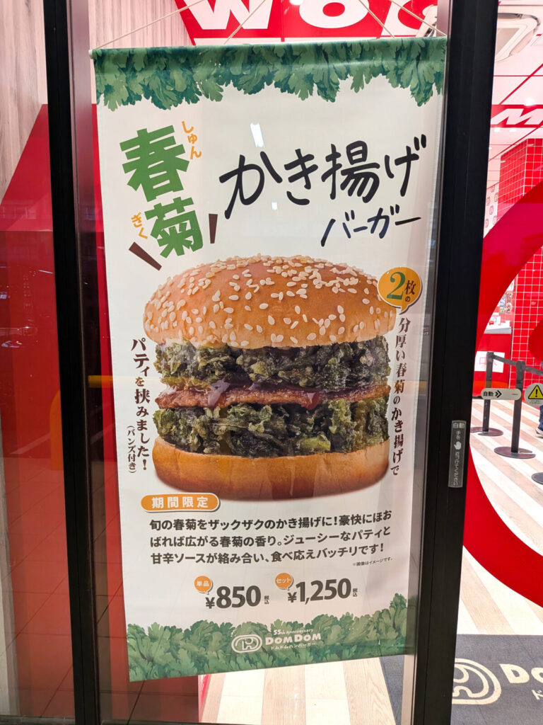 店頭にもでてた、でてた、「春菊かき揚げバーガー」のタペストリー。