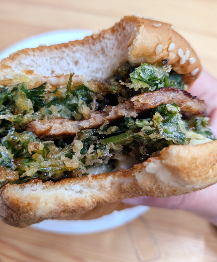 バンズをちょっと開けてみると…、春菊のかき揚げがどーん。