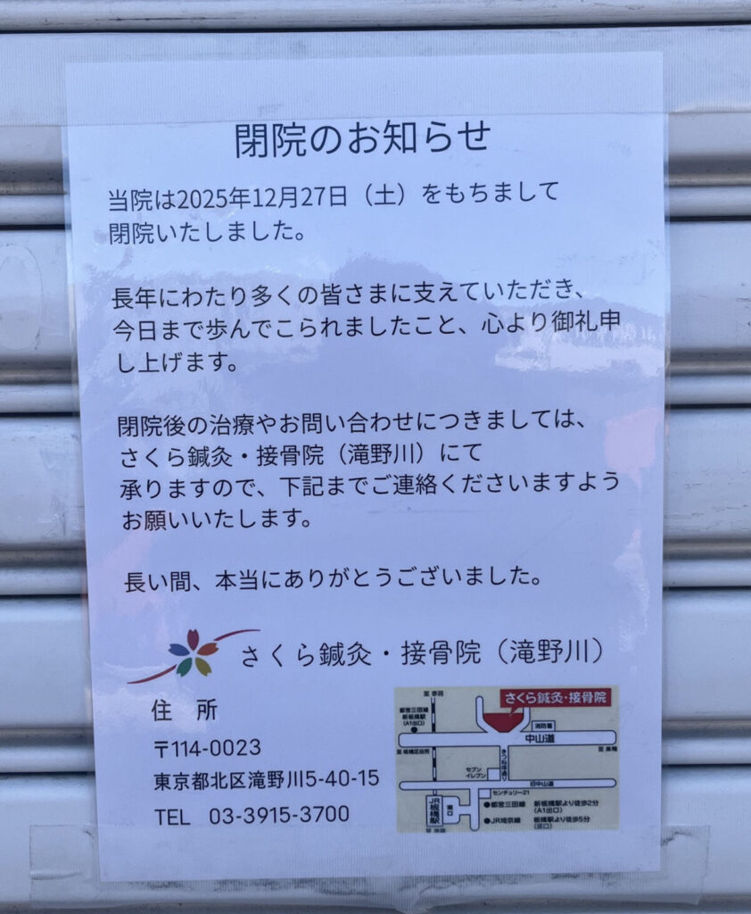 十条富士見商店街にあった「さくら整骨院」が、12月27日をもって閉院したみたい。
