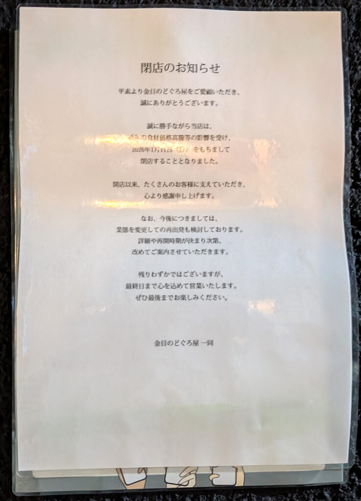 店頭には1月11日をもって閉店のお知らせが残っていました。