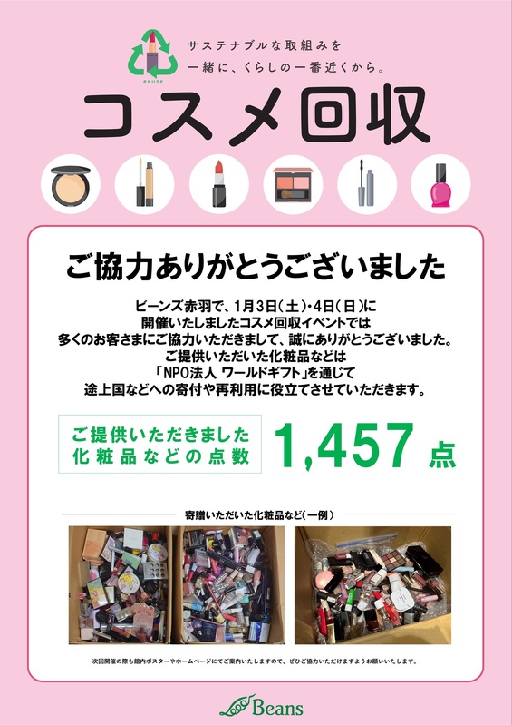 ビーンズ赤羽で1月3日(土)・4日(日)に実施されたコスメ回収イベントの結果が発表されました。