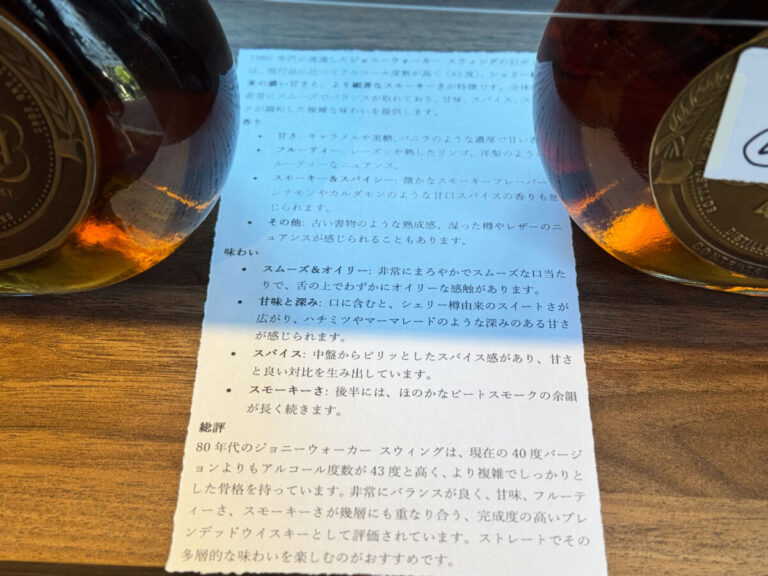 香りや味わい、総評まで書かれた説明書が各ウイスキーのそばにあり、自分の好みに合わせて選びやすい!
