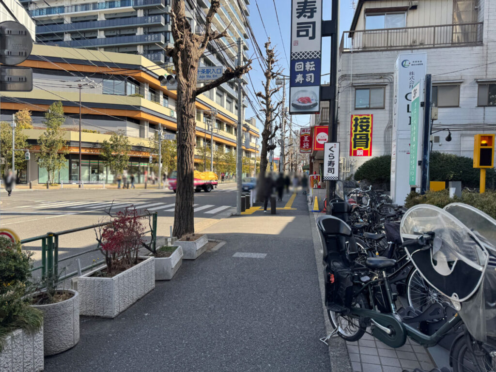 店舗予定地を背にして右はこんな感じ。「餃子の王将」や、お豆腐屋さん「小松屋」などがあり、斜め向かいにはジェイトモール。