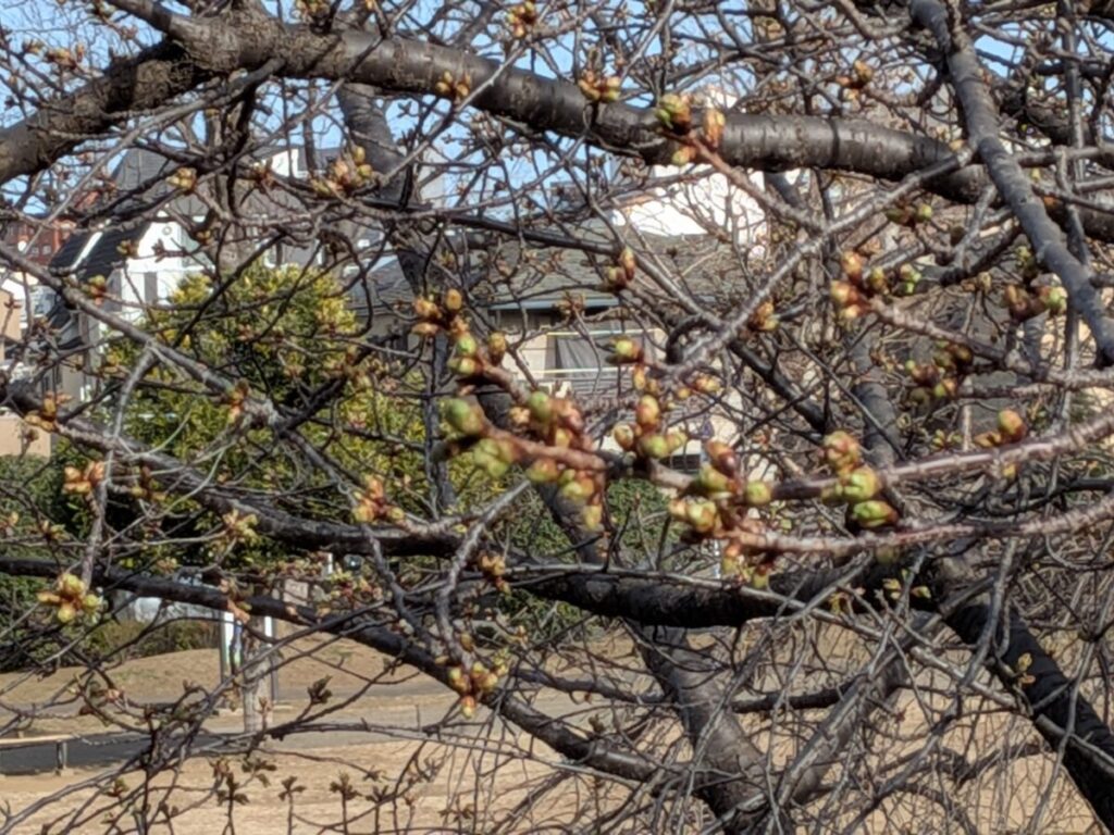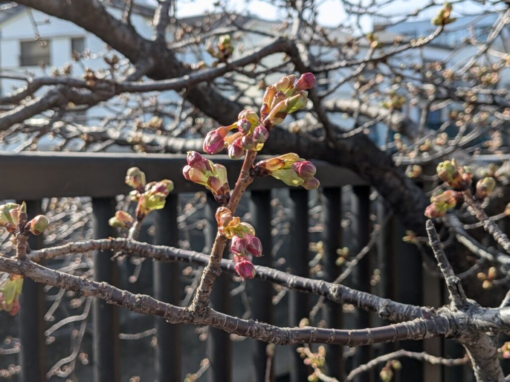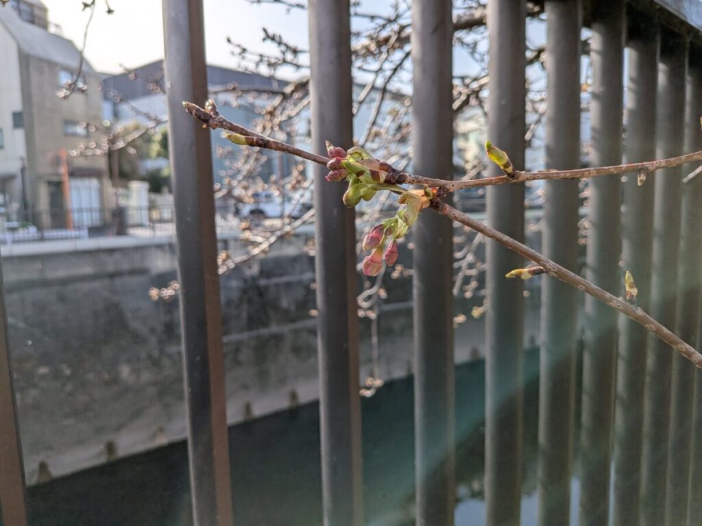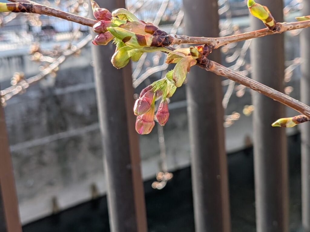 滝野川で春の気配。谷津観音前の河津桜の蕾がふくらんでた!