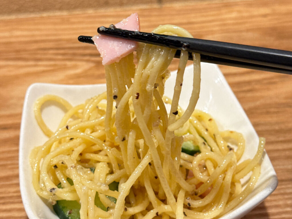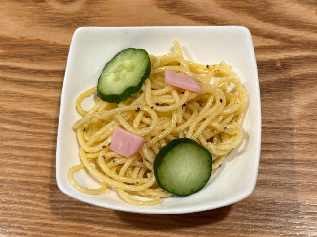 すぐに「お通し(350円)」の登場。いぇ〜い!サラダスパゲッティだ!