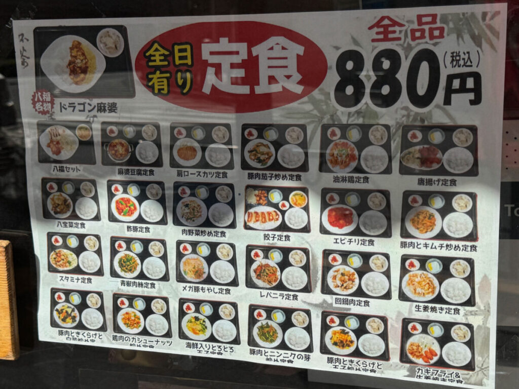 店頭に貼ってあったメニューがこちら。1日を通して頼める定食、全品880円!