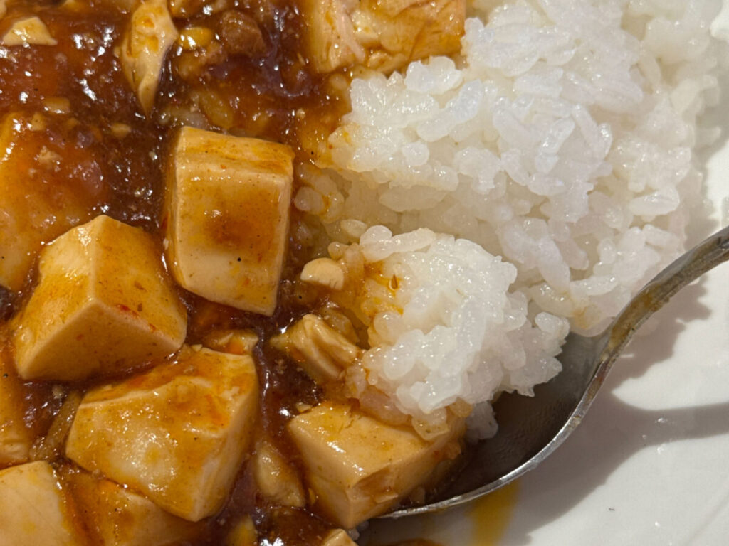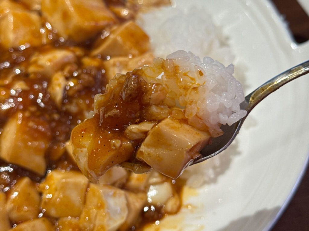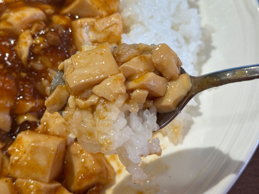 とろっとろの麻婆豆腐とご飯を5:5にしまして、がぶっと!