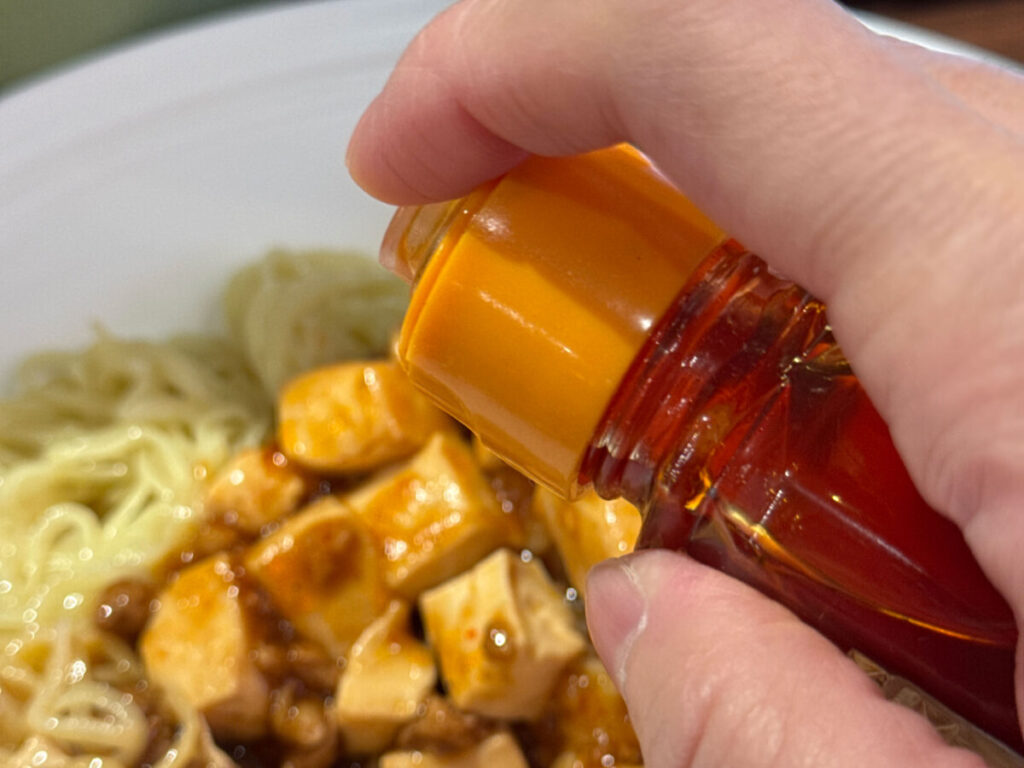 さあ、ドラゴン麻婆に戻りまして。ここからは、ラー油を垂らして味変タ〜イム!