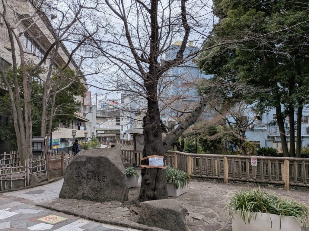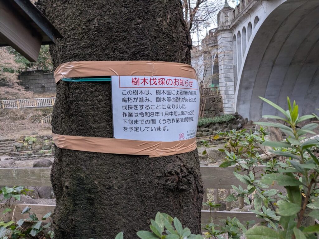 音無橋の真下の立ってる桜で、樹木医による診断の結果、腐朽が進んで、倒木の恐れがあるとのことから伐採が決まったみたい。
