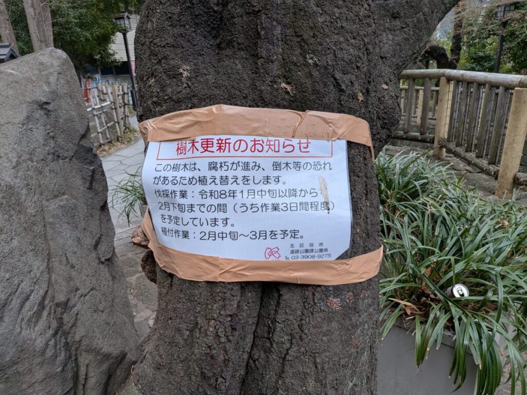 また、近くには植え替え予定のお知らせが出ている樹木もありましたよ。