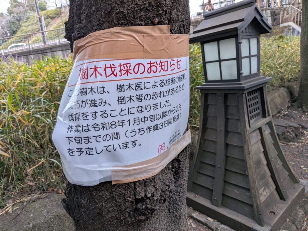 王子の音無親水公園の桜の木が伐採されるみたい。「樹木伐採」のお知らせがでてました。