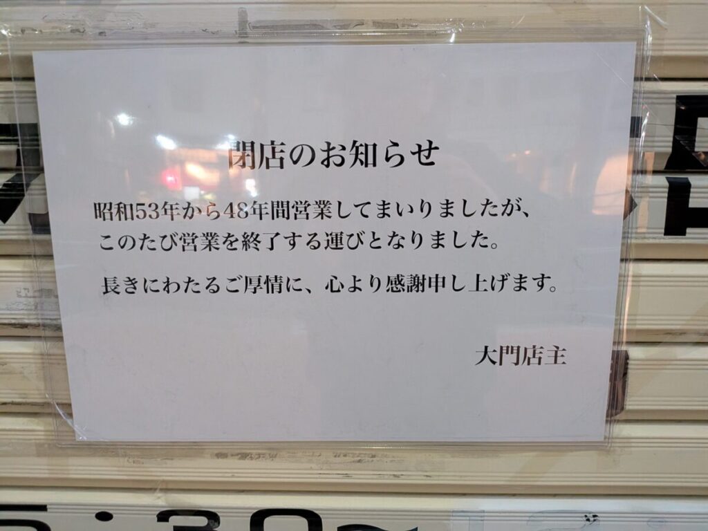 貼り紙をみると、「焼肉 大門」は昭和53年から営業していたとのこと。およそ48年間、この場所で暖簾を掲げてきたお店だったようですね。