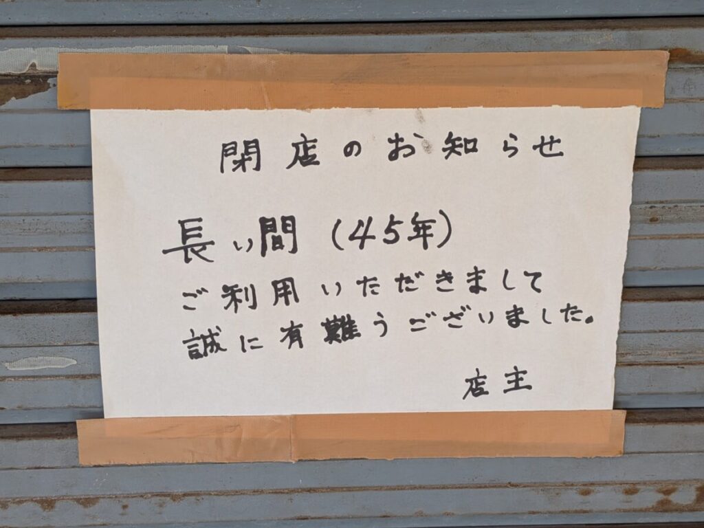 「閉店のお知らせ」と題して、「長い間(45年)ご利用いただきまして誠に有難うございました」と記載されています。