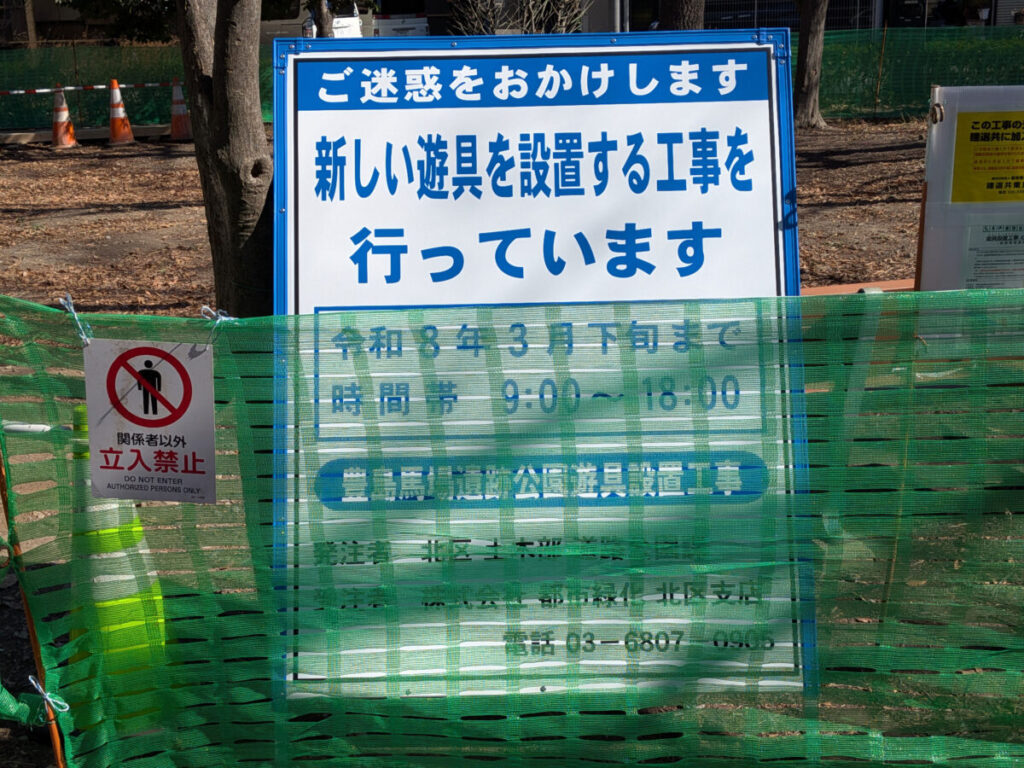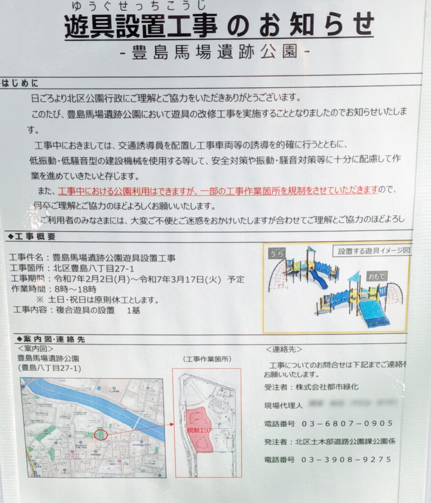 豊島馬場遺跡公園に、新しい複合遊具が設置されるみたい!現地にお知らせが出ていましたよ。